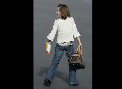 Now, I really do not want to believe that seven-year-old Piper is the proud owner of her own Louis Vuitton Montorguiel PM ($790 at eluxury.com). More likely, some enterprising photog caught her helpfully looking after Mommy’s handbag while Mommy was off serving mooseburgers or something.